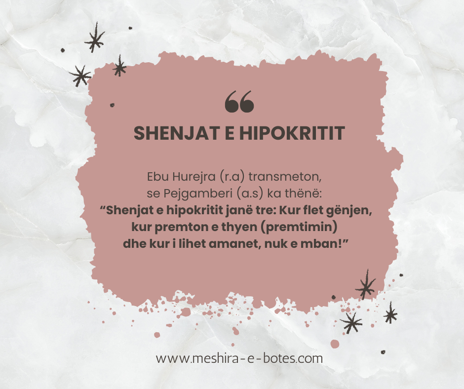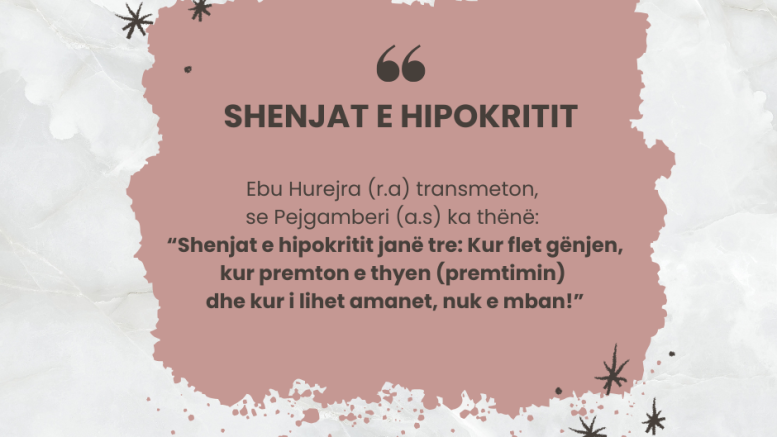 “Shenjat e hipokritit janë tre: Kur flet gënjen, kur premton e thyen (premtimin) dhe kur i lihet amanet, nuk e mban!”