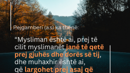 Abdullah ibn Amër (r.anhuma) transmeton, se Pejgamberi (a.s) ka thënë: “Mysliman është ai, prej të cilit myslimanët janë të qetë prej gjuhës dhe dorës së…